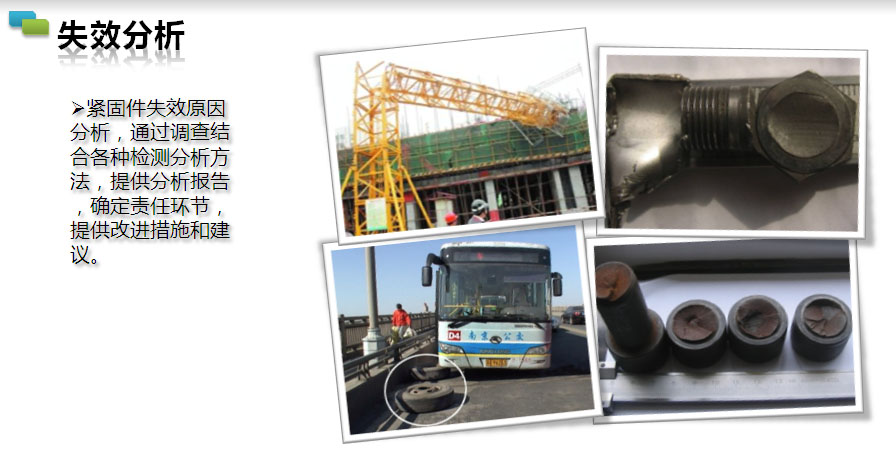 近年來,先后開展過以下產(chǎn)品失效分析(部分):六角頭螺栓、螺釘(斷裂件)、墊圈組合件、 基環(huán)(汽缸)、彈簧墊圈、焊釘、避雷銷、發(fā)動機齒輪、曲軸減震皮帶輪固定螺栓、半軸套管、ED堵頭、螺桿(斷裂件)、馬車螺栓、汽車輪轂螺栓、工程機械軸套、不銹鋼腐蝕分析、風(fēng)電螺栓、電鍍產(chǎn)品、曲軸連桿、合金失效件等等。