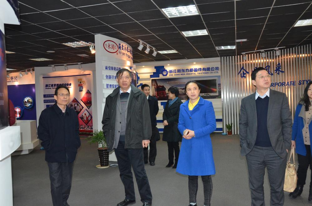 圖為呂逸君局長(左二)在孫雄偉副縣長(左一)陪同下,在海鹽緊固件展示中心聽取公司副總經(jīng)理張青春(右二)的介紹。