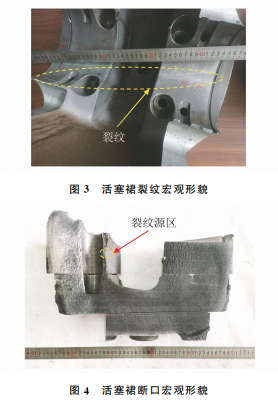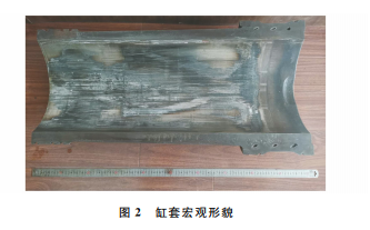 某船用柴油發(fā)動機在運行時發(fā)生拉缸事故,經(jīng) 停機拆解后發(fā)現(xiàn)其活塞裙存在裂紋,且缸套內(nèi)壁磨 損嚴重并存在大量周向裂紋,為了查明該事故原因, 筆者對其進行了失效分析。圖1,2分別為拆解后活 塞裙和缸套的宏觀形貌,活塞裙材料為 4032 鋁合 金,缸套材料為灰鑄鐵。