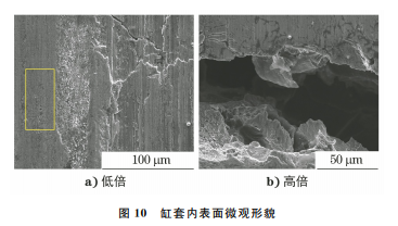 活塞裙內(nèi)孔壁次表面存在疏松缺陷,材料疏松 區(qū)域為應(yīng)力集中點,活塞裙在工作環(huán)境中承受一定 的交變應(yīng)力,在交變應(yīng)力作用下,活塞裙從疏松區(qū)域 產(chǎn)生裂紋并以疲勞形式擴展,最終發(fā)生大面積開裂。 活塞裙開裂后,缸套與活塞裙之間間隙變小,導(dǎo)致兩 者直接接觸擠壓,缸套與活塞裙之間相對運動時,缸 套內(nèi)表面與活塞裙外表面產(chǎn)生劇烈摩擦,發(fā)生黏著 磨損[2],活塞裙與缸套內(nèi)表面存在很大的摩擦力,引 發(fā)缸套內(nèi)表面開裂,最終發(fā)生拉缸事故。