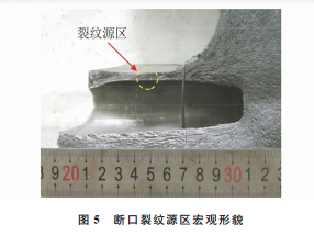 活塞裙裂紋宏觀形貌如圖3所示,可見裂紋基 本貫穿活塞裙?;钊箶嗫诤暧^形貌如圖4所示,未見明顯塑性變形,放射紋特征明顯(見圖4箭頭 處),其斷口裂紋源區(qū)的宏觀形貌如圖5所示。