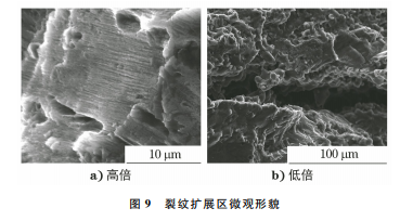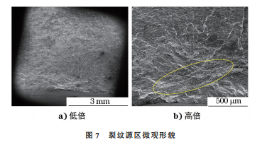 將活塞裙裂紋源區(qū)的樣品清洗后置于掃描電子 顯微鏡(SEM)下進行觀察,試樣裂紋源區(qū)微觀形貌 如圖7所示,可見放射紋收斂于次表面處,放大觀 察,該位置存在疏松缺陷,疏松缺陷微觀形貌如圖8 所示。裂紋擴展區(qū)微觀形貌如圖9所示,可見疲勞 輝紋,這為疲勞斷裂的典型微觀特征,裂紋擴展區(qū)也 存在疏松缺陷。
