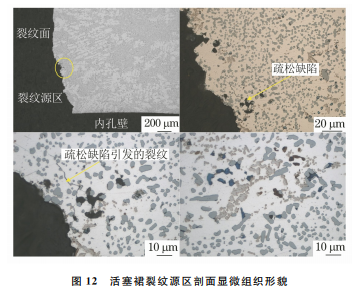 活塞裙與缸套發(fā)生拉缸的原因是:由活塞裙內(nèi) 孔壁次表面疏松缺陷引起活塞裙疲勞開裂,開裂后 活塞裙與缸套配套間隙減小,活塞裙與缸套相對運 動時發(fā)生黏著磨損,最終發(fā)生拉缸事故。