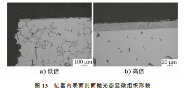 截取缸套裂紋剖面金相試樣,經(jīng)鑲嵌、磨拋后置于 金相顯微鏡下觀察,缸套內(nèi)表面剖面拋光態(tài)顯微組織 形貌如圖13所示,可見缸套裂紋附近內(nèi)表面存在一層 覆蓋物。對覆蓋物進行能譜分析,結(jié)果如圖14所示, 發(fā)現(xiàn)該覆蓋物成分存在較高含量的鋁元素。