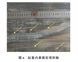 缸套內(nèi) 表 面 宏 觀 形 貌 如 圖 6 所 示,可 見 裂 紋 數(shù)量較多,絕 大 部 分 裂 紋 沿 周 向 分 布,裂 紋 較 直, 同時存 在 明 顯 的 縱 向 分 布 且 與 裂 紋 垂 直 的 磨 擦 痕跡。