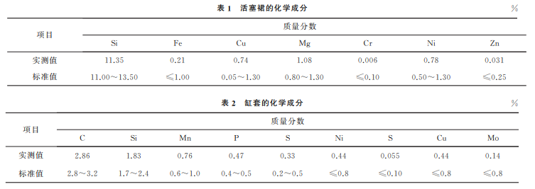 分別在活塞裙和缸套上取樣,進行化學(xué)成分的 定量分析,結(jié)果如表1,2所示。由表1可知,活塞裙 和缸套的化學(xué)成分均符合技術(shù)要求。