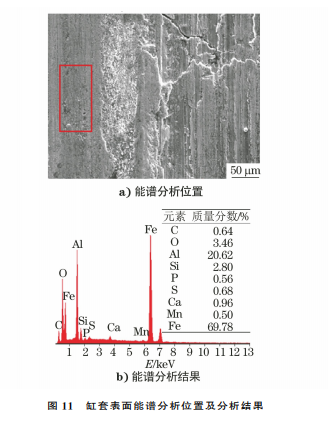 將缸套裂紋試樣清洗后置于掃描電子顯微鏡下 觀察,缸套內(nèi)表面微觀形貌如圖10所示,在內(nèi)表面 上觀察到與裂紋方向大致垂直的摩擦痕跡。對缸套內(nèi)表面的摩擦痕跡進行能譜分析,發(fā)現(xiàn)存在較高含 量的鋁元素,說明缸套和活塞裙之間發(fā)生了黏著磨 損,表面能譜分析結(jié)果如圖11所示。