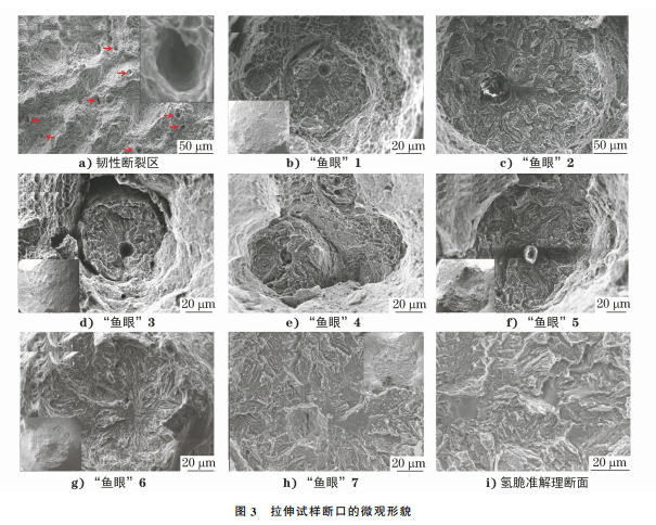 在掃描電鏡下觀察到拉伸試樣斷口纖維區(qū)上含 有較多氣泡、韌窩以及多處近似圓形的“魚眼”型缺 陷,其特征為中心有一暗色的核心,該核心是夾雜物 或者氣孔,周圍是氫脆準(zhǔn)解理特征。在沖擊試樣斷 口上未觀察到此類形貌,且在試樣上也沒有發(fā)現(xiàn)發(fā) 紋,這與“魚眼”氫損傷的特征一致[1-2]。拉伸試樣的 “魚眼”缺陷是一種可逆氫脆白點,有的資料中也稱 為拉伸白點[3],但由于“魚眼”尺寸較小,因此在拉伸 斷口上肉眼并未觀察到小亮點或白斑?!棒~眼”產(chǎn)生 的主要原因是鋼中含有一定數(shù)量的氫,但所含的氫 還不足以造成材料內(nèi)部開裂。一般鋼中的氫含量達 到5×10 6 以上就會產(chǎn)生氫致裂紋,但對于高強度的 鋼而言,即使氫含量低于1×10 -6,也會由于應(yīng)力的 交互作用發(fā)生氫脆[4]。