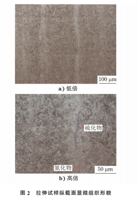 金相檢驗結(jié)果表明,經(jīng)過二次淬火+低溫回火 處理后,基體組織為回火馬氏體。縱截面的顯微組 織有輕微的條狀偏析,條帶淺色區(qū)中有富集的硫化 錳類夾雜物以及氮化鈦類夾雜物,說明材料存在一 定程度的顯微偏析、夾雜物及沉淀相等缺陷。