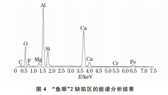 在拉伸試樣斷口側(cè)取樣,對多個試樣進行超聲波 清洗后,將其置于掃描電鏡下觀察,拉伸試樣斷口的微 觀形貌如圖3所示。由圖3a)可以看出,拉伸試樣斷口 纖維區(qū)較平坦,局部區(qū)域含有數(shù)量不等、顏色襯度與韌 性斷裂基體不同的小區(qū)域。放大觀察纖維區(qū),發(fā)現(xiàn)整體呈韌性斷裂形貌,韌窩內(nèi)無夾雜物,周圍是等軸小韌 窩,但斷口上含有較多氣泡孔洞,放大可以看到氣泡壁 變形形成的褶皺形貌特征。對顏色與基體不同的區(qū)域 進行放大觀察,發(fā)現(xiàn)近似圓形的“魚眼”缺陷形貌,直徑 為幾十微米到幾百微米,其中心有一夾雜物或者氣孔, 夾雜物的周圍為氫脆準(zhǔn)解理斷裂形貌,有的“魚眼”區(qū) 域與周圍的韌性斷裂基體已經(jīng)分離。觀察沖擊試樣斷 口,未發(fā)現(xiàn)類似的形貌,斷口呈韌性斷裂特征,但韌窩 深度較淺且韌窩內(nèi)無夾雜物。對“魚眼”2缺陷區(qū)中的 夾雜物進行能譜分析,結(jié)果如圖4所示,可見夾雜物中 主要含鋁 、鈣 、硅、氧等元素,結(jié)合其形貌特征進行綜 合分析,得到該夾雜物是鋁的復(fù)合氧化物。