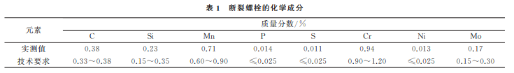 從斷裂螺栓上取樣,對(duì)其進(jìn)行化學(xué)成分分析,見(jiàn)表1,螺栓的化學(xué)成分滿足客戶提供的技術(shù)要求。