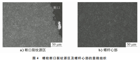 在斷裂螺栓斷口裂紋源區(qū)和螺桿心部沿軸向截 取剖面試樣,經(jīng)鑲嵌、磨拋和化學(xué)試劑浸蝕后,置于 光學(xué)顯微鏡下觀察其顯微組織。如圖4所示:螺栓 斷口裂紋源區(qū)可見(jiàn)沿晶開(kāi)裂形貌特征,裂紋源區(qū)的 顯微組織為回火馬氏體,可見(jiàn)少量碳化物;螺桿心部 的顯微組織為回火馬氏體,可見(jiàn)少量碳化物。