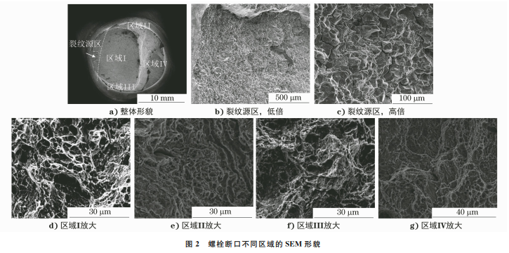 將螺栓斷口充分清洗后,置于 Quanta400FEG 型掃描電鏡(SEM)下觀察其形貌,如圖2a)所示,可 見(jiàn)斷口大部分區(qū)域較為平整,斷口主要分為四個(gè)區(qū) 域,區(qū)域IV 顏色較暗。將圖2a)中裂紋源區(qū)進(jìn)一步 放大觀察,如圖2b),c)所示,可見(jiàn)沿晶斷裂和韌窩 形貌,有少量二次裂紋,局部晶面可見(jiàn)雞爪狀變形 紋。將 圖 2a)中 其 它 區(qū) 域 進(jìn) 一 步 放 大 觀 察,如 圖2d)~g)所示,均可見(jiàn)韌窩形貌。