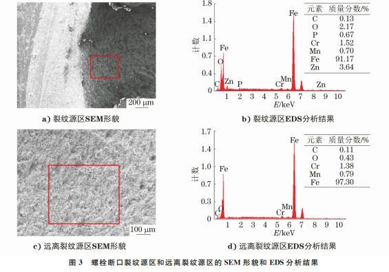 斷裂發(fā)生于螺栓頭部圓角處,斷口大部分區(qū)域 較為平整、潔凈,斷面與軸向大致垂直,未見(jiàn)明顯塑 性變形區(qū)域,局部區(qū)域顏色較深。由掃描電鏡分析 結(jié)果可知:裂紋源區(qū)可見(jiàn)沿晶開(kāi)裂+二次裂紋+韌 窩的形貌特征,局部可見(jiàn)雞爪紋;其他區(qū)域呈韌窩形 貌特征。由能譜儀分析結(jié)果可知,裂紋源區(qū)存在鋅 和磷元素,這是在磷酸鋅表面處理過(guò)程中滲入的,裂 紋源區(qū)存在初始裂紋。