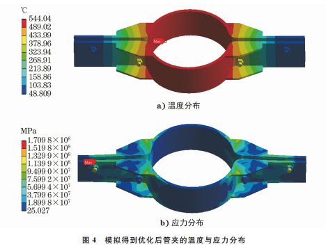 (1)在高溫環(huán)境中,管夾在直段與彎曲段的轉(zhuǎn) 角處存在應(yīng)力集中現(xiàn)象,其等效應(yīng)力超過相應(yīng)溫度 下材料的屈服強(qiáng)度,導(dǎo)致管夾變形。