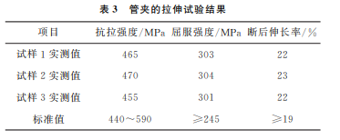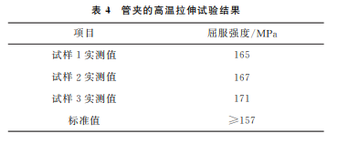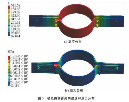 管夾彎曲段(試樣1)長期處于高溫環(huán)境中,保 溫層外的管夾直段(試樣3)所處環(huán)境的最高溫度不 超過80℃,兩處試樣的化學(xué)成分和拉伸性能均基本 相同,不存在長期高溫作用導(dǎo)致材料強(qiáng)度降低的情 況??紤]到管夾彎曲段長期處于高溫環(huán)境中,對該 管夾進(jìn)行熱-結(jié)構(gòu)耦合分析,研究管夾在高溫環(huán)境中 的應(yīng)力分布情況。