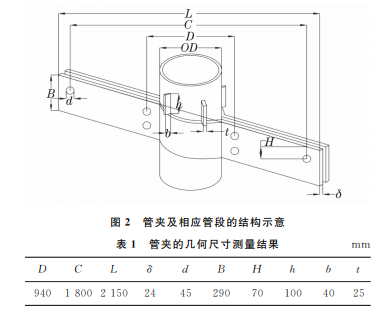 變形立管管夾及相應(yīng)管段的結(jié)構(gòu)示意如圖2所 示。管道外徑為747.5mm,壁厚為34mm,管夾的 相關(guān)尺寸見表1。
