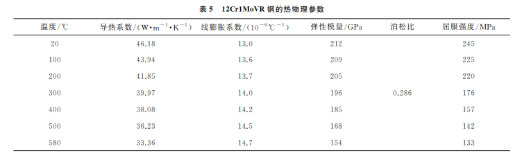 根據(jù)管夾的實(shí)際尺寸和熱物理參數(shù),建立管夾 的有限元模型,管道與管夾之間、管夾與螺栓之間通 過接觸屬性設(shè)置連接,其相關(guān)熱物理參數(shù)見表 5。 該管段保溫層厚度為260mm,為簡化計(jì)算,保溫層 視為絕熱,管夾與空氣設(shè)置為對流換熱,對管道內(nèi)壁 施加545 ℃的溫度載荷。在管道運(yùn)行穩(wěn)定后,管夾 基本處于靜止?fàn)顟B(tài),主要承受管道的重力,在結(jié)構(gòu)分 析中,限制管道拉桿的豎向位移,只考慮重力對管夾 的影響。