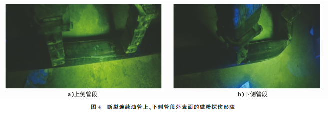 根據(jù) NB/T47013.4-2015《承壓設(shè)備無損檢測 第4部分:磁粉檢測 PPT》標(biāo)準(zhǔn),采用 CJZ-212E 型 磁軛設(shè)備,對斷裂連續(xù)油管外表面進行磁粉探傷檢 測。如圖4所示,該斷裂連續(xù)油管上、下側(cè)管段外表 面未發(fā)現(xiàn)裂紋。