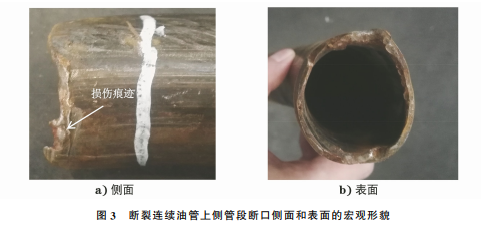 如圖3所示,上側(cè)管段斷口側(cè)面未見變形,無明 顯頸縮現(xiàn)象,斷口附近可見輕微損傷痕跡;斷口表面 輕微脹大,大部分區(qū)域受到損壞,局部區(qū)域斷面平 坦,表面呈輕微金屬色,無明顯剪切唇。