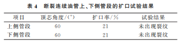 分別在斷裂連續(xù)油管上側(cè)和下側(cè)管段截取擴口 試樣,試樣尺寸為?44.5mm×3.68mm×50mm, 根 據(jù) ASTM A450/A450M-21 Standard SpecificationforGeneralRequirementsforCarbon and Low Alloy Steel Tubes 標(biāo) 準(zhǔn),采 用 UHF500KNI型試驗設(shè)備進行擴口試驗,結(jié)果見表4,未 發(fā)現(xiàn)連續(xù)油管表面有裂紋萌生。