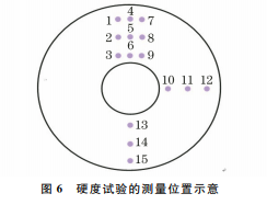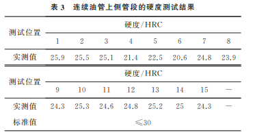 在連 續(xù) 油 管 上 側(cè) 管 段 截 取 環(huán) 形 試 樣,根 據(jù) ASTM E18-17《金屬材料洛氏硬度標(biāo)準(zhǔn)試驗方法》, 采用 BH3000型硬度測量系統(tǒng)進行硬度測試,測量 位置如圖6所示。由表3可見,斷裂連續(xù)油管上側(cè)管段的硬度滿足 SY/T6895-2012標(biāo)準(zhǔn)對 CT110 鋼的要求。