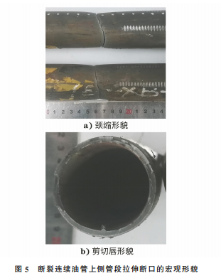 (1)該連續(xù)油管斷裂的原因是:連續(xù)油管在下 井過程中,管壁發(fā)生結(jié)臘,導(dǎo)致下井受阻,連續(xù)油管 受到壓縮載荷,當(dāng)壓縮載荷超過材料屈服強度后,連 續(xù)油管發(fā)生壓縮變形,使其發(fā)生斷裂。