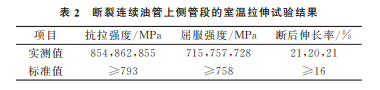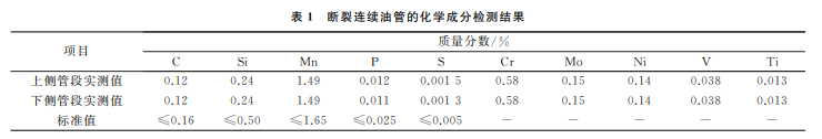 分別從斷裂連續(xù)油管上側(cè)和下側(cè)管段上截取試 樣,根據(jù) ASTM A751-14a《鋼產(chǎn)品化學(xué)分析的試驗 方法、規(guī)程和術(shù)語》標(biāo)準(zhǔn),采用 ARL4460型直讀光 譜儀進行化學(xué)成分分析。由表1可見,連續(xù)油管上、 下側(cè)管段的化學(xué)成分均滿足 SY/T6895-2012《連續(xù)油管》標(biāo)準(zhǔn)對 CT110鋼的技術(shù)要求。
