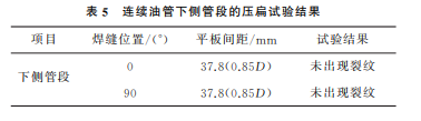 在斷裂連續(xù)油管下側(cè)管段截取壓扁試樣,試樣 尺寸為?44.5mm×3.68mm×70mm,依據(jù) GB/T 246-2007《金 屬 管 壓 扁 試 驗 方 法 》,采 用 UHF500KNI型壓扁試驗設(shè)備進行壓扁試驗,測量結(jié)果 見表5,未發(fā)現(xiàn)連續(xù)油管下側(cè)管段表面有裂紋萌生 (表5中D 為連續(xù)油管外徑)。