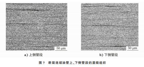 分別在斷裂連續(xù)油管上、下側(cè)管段截取試樣,根 據(jù) ASTM E3-11-2011《金 相 試 樣 的 制 備 標(biāo) 準(zhǔn)》、 ASTM E45-13《夾雜物分析標(biāo)準(zhǔn)》及 ASTM E112-13-2013《測定平均晶粒度的標(biāo)準(zhǔn)試驗方法》,采用 MEF4M 型金相顯微鏡、圖像分析系統(tǒng)和 OLS4100 型激光共聚焦顯微鏡分別進行顯微組織觀察、晶粒 度分析及非金屬夾雜物分析。由表6和圖7可見: 斷裂連續(xù)油管上、下側(cè)管段的顯微組織未見異常,均 為粒狀 貝 氏 體 組 織;晶 粒 度 為 12.0 級,晶 粒 度 無 異常。
