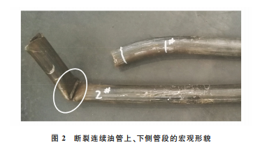 斷裂連續(xù)油管上、下側(cè)管段的宏觀形貌如圖2 所示,兩節(jié)連續(xù)油管管段外表面光滑,無腐蝕痕跡; 下側(cè)管段有一處被折斷,據(jù)現(xiàn)場了解,這是連續(xù)油管發(fā)生斷裂后,為防止連續(xù)油管落井,關(guān)閉防噴器時夾 傷所致。