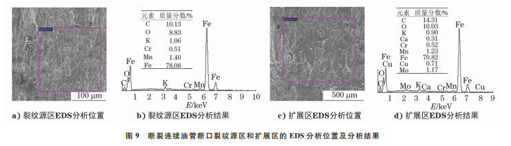 采用能譜儀(EDS)對斷口裂紋源區(qū)及擴展區(qū)進 行分析。如圖9所示,其表面主要含有碳、氧、鐵元 素,未發(fā)現(xiàn)硫、氯等井下腐蝕性元素,說明該連續(xù)油 管未發(fā)生明顯的腐蝕。