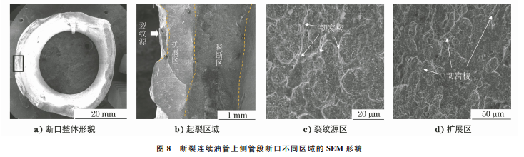 將斷裂連續(xù)油管上側(cè)管段斷口用酒精超聲清洗 后,采用 TESCAN VEGA Ⅱ型掃描電鏡(SEM)進 行斷口形貌觀察。由圖8可見:該連續(xù)油管斷口未 見頸縮現(xiàn)象,呈現(xiàn)明顯擠壓形貌;將圖8a)中方框處 放大觀察發(fā)現(xiàn),起裂區(qū)域管體外表面呈明顯的撕裂 特征,見圖8b)中箭頭處,為斷口的裂紋源區(qū),從撕 裂區(qū)向內(nèi)表面過渡的擴展區(qū)可見明顯的平臺區(qū),平 臺區(qū)外靠近內(nèi)表面為剪切瞬斷區(qū);裂紋源區(qū)及擴展 區(qū)均呈擠壓形成的拉長狀韌窩形貌。