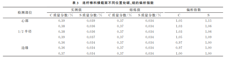 碳偏析指數(shù)的技術(shù)要求為不大于1.1,硫偏析 指數(shù)的技術(shù)要求為不大于1.15 。由表3可見:連 桿棒料 橫 截 面 1/2 半 徑 處 碳 的 平 均 質(zhì) 量 分 數(shù) 為 0.383%,平均偏析指數(shù)約為 1.04 ;1/2半徑處硫 的平均 質(zhì) 量 分 數(shù) 為 0.036%,平 均 偏 析 指 數(shù) 約 為 1.05;邊緣區(qū) 域 碳 的 平 均 質(zhì) 量 分 數(shù) 為 0.363%,平 均偏析指數(shù)約為0.98;邊 緣 區(qū) 域 硫 的 平 均 質(zhì) 量 分 數(shù)為0.034%,平均偏析指數(shù)約為1.00。連桿棒料 橫向斷面 的 碳、硫 偏 析 程 度 較 小,符 合 技 術(shù) 要 求。 連桿棒料橫 截 面 不 同 位 置 處 的 碳、硫 含 量 從 高 到 依次為心部、1/2半徑處、邊緣區(qū)域。綜上所述,連 桿棒料橫截 面 的 低 倍 組 織 和 碳、硫 偏 析 指 數(shù) 均 符 合技術(shù)要求。