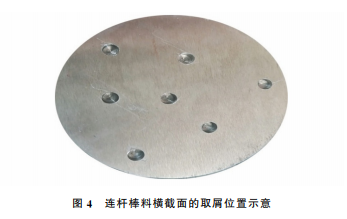 在連桿棒料截取橫截面試樣,經(jīng)酸性溶液浸蝕 后進行低倍組織檢測,見圖3。低倍組織檢測后,將 試樣打磨、拋光后,在試樣心部、1/2半徑以及邊緣 三個偏析嚴(yán)重位置處,用6mm 的鉆頭分別鉆1,3, 3個點進行取屑(取屑位置見圖4),用紅外碳硫儀進 行碳、硫含量檢測,通過偏析指數(shù)(碳、硫含量實測值 與碳、硫熔煉值的比值)表征連桿棒料橫截面不同位 置處的偏析程度,結(jié)果見表3,表3中的熔煉值來源于鋼廠提供的檢測報告。