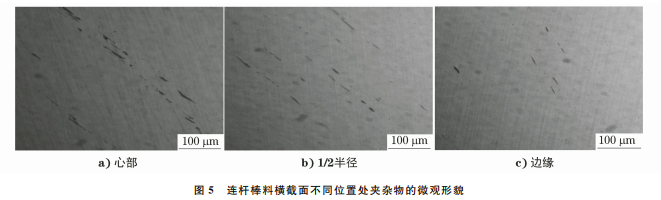 分別從連桿棒料橫截面心部、1/2半徑以及邊 緣偏析嚴(yán)重位置處取樣,根據(jù) GB/T10561-2005 《鋼中非金屬夾雜物含量的測定標(biāo)準(zhǔn)評級圖顯微檢 驗法》,采用 GX71型奧林巴斯金相顯微鏡進行觀 察檢測。由圖5可見,與連桿棒料橫截面1/2半徑 和邊緣處相比,其心部夾雜物最多,夾雜物主要為硫 化物,呈長條狀且沿軋制方向伸展。心部硫化物評 級為粗系2級,1/2 半徑處硫化物評級為粗系 1.5 級,邊緣處硫化物評級為粗1級。