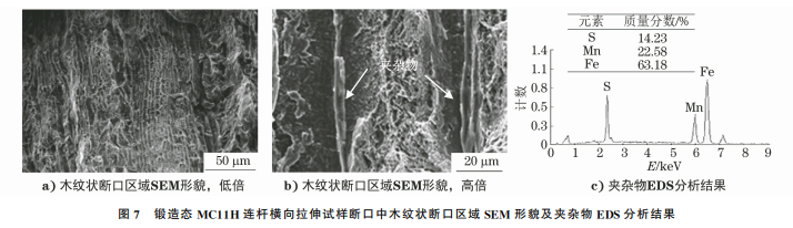 采用蔡司Sigma500型掃描電鏡(SEM)對鍛造 態(tài) MC11H 連桿橫向拉伸斷口的木紋狀斷口區(qū)域進 行觀察,采用JED-2200型能譜儀(EDS)對木紋狀斷 口處的夾雜物成分進行分析。如圖7a)、b)所示,木 紋狀斷口區(qū)域可見許多平行的溝槽,溝槽擴展方向 與鍛造流線方向一致,溝槽內(nèi)均存在條狀夾雜物,溝 槽兩側(cè)可見細(xì)小的韌窩。如圖7c)所示,木紋狀斷 口區(qū)域夾雜物主要為 MnS。