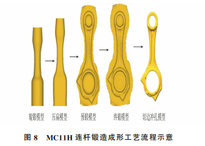 連桿棒 料 橫 截 面 的 硫 化 物 為 長 條 狀,鍛 造 態(tài) MC11H 連桿橫向拉伸斷口中硫化物呈短條狀斷續(xù) 分布,是在連桿鍛造過程形成的。MC11H 連桿是 通過鍛 造 和 切 邊 沖 孔 工 藝 加 工 而 成 的,圖 8 是 MC11H 連桿鍛造成形工藝流程示意。