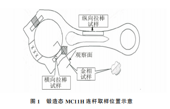 脹斷 MC11H 連桿在試生產(chǎn)過程中,原材料縱向 和橫向拉伸性能均符合標(biāo)準(zhǔn)要求。原材料經(jīng)鍛造成形 后,分別在鍛造態(tài)連桿大頭和連桿體處取橫向和縱向 拉棒試樣進行拉伸試驗,取樣位置見圖1所示,其拉抻 性能見表1,鍛造態(tài) MC11H 連桿橫向的斷面收縮率遠(yuǎn) 低于技術(shù)要求,其余拉伸性能均滿足技術(shù)要求。