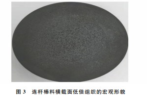 低倍組織的技術(shù)要求為一般疏松不大于2級, 中心疏松不大于2級,錠型偏析不大于2級。連桿 棒料橫截面的低倍組織檢測結(jié)果為一般疏松1級, 中心疏松1級,錠型偏析、一般斑點狀偏析和邊緣斑點狀偏析都為0級,均符合技術(shù)要求。