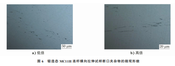 (1)MC11H 連桿大頭端橫向的斷面收縮率低 是該處密集分布的大量短條狀 MnS夾雜物導(dǎo)致的。