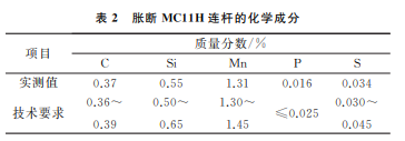 脹斷 MC11H 連桿的材料牌號為C38ModBY,采用 直徑為68mm的圓形鋼棒,經(jīng)輥鍛、預(yù)鍛及終鍛等工序 進行鍛造成形,其加工工藝流程為下料→感應(yīng)加熱→ 輥鍛→壓扁→預(yù)鍛→終鍛→切邊→沖孔→控冷→機加 工。在鍛造態(tài) MC11H 連桿大頭處截取橫向拉棒試樣 進行拉伸試驗,試驗后發(fā)現(xiàn)其橫向拉棒試樣的斷面收 縮率偏低。筆者通過宏觀觀察、化學(xué)成分分析、斷口分 析、金相檢驗、掃描電鏡及能譜分析等方法,分析了漲 斷 MC11H 連桿橫向斷面收縮率偏低的原因,以期進一 步改善 MC11H 連桿的橫向拉伸性能。