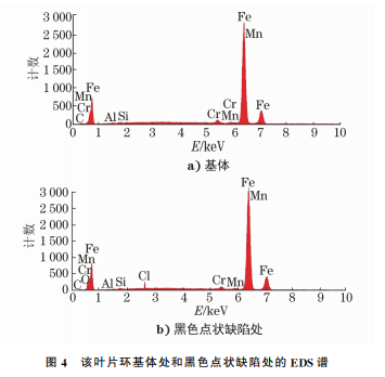 采用 EM-30AX 型能譜儀(EDS),對該葉片環(huán) 黑色點狀缺陷處和基體處進行元素分析。由圖4可 見,基體處未檢測到氯元素,黑色點狀缺陷處存在氯 元素。