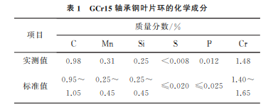 采用 ARL4460型直讀光譜儀檢測該葉片環(huán)的 化學成分。由表1可見,其化學成分符合標準 GB/ T18254-2016《高碳鉻軸承鋼》中對 GCr15軸承鋼 的技術(shù)要求。
