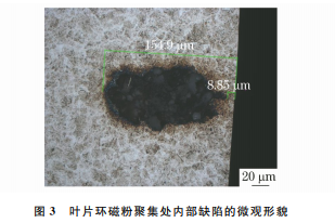 在該葉片環(huán)磁粉聚集處截取剖面試樣,經(jīng)鑲嵌、 磨拋后,用4%(體積分數(shù))硝酸酒精浸蝕,采用蔡司 Axioobserver.A1m 型光學顯微鏡進行觀察。由圖 3可見,在距該葉片環(huán)側(cè)面8.9μm 深度處存在黑色 點狀缺陷,缺陷長度約為146μm。
