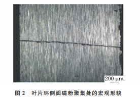 采用蔡司Stemi2000-C型體視顯微鏡,觀察該 葉片環(huán)側(cè)面磁粉聚集處的宏觀形貌。由圖2可見, 該葉片環(huán)側(cè)面沿軸向可見線條狀磁粉聚集現(xiàn)象,將 其擦拭后,外表面無肉眼可見的磁粉聚集現(xiàn)象,推測 該缺陷位于零件產(chǎn)品內(nèi)部。