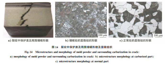 另外,保護(hù)渣的裂紋或折疊周圍有時(shí)存在明顯 的增碳現(xiàn)象。圖14是低碳低合金齒輪鋼軋材表面 裂紋中存在保護(hù)渣、裂紋周圍存在明顯增碳現(xiàn)象,增 碳部位組織為近共析成分的珠光體+極少量鐵素 體,正?;w部位組織為鐵素體+珠光體。
