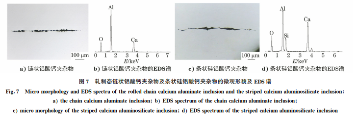 煉鋼采用鋁脫氧加鈣處理可進(jìn)行復(fù)合脫氧脫 硫,形成復(fù)合型球形夾雜物易于上浮去除。遺留在 連鑄坯中的夾雜物經(jīng)熱軋后,根據(jù)其Ca/Al含量比 的不同其形態(tài)有所不同,Ca/Al含量比低時(shí)呈鏈狀 分布,Ca/Al含量比高時(shí)呈條狀分布,若采用Si-Ca 進(jìn)行處理,則形成硅鋁酸鈣類條狀?yuàn)A雜物,見圖7。