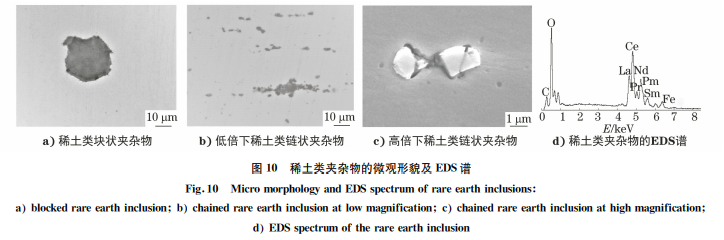 鋼中加稀土處理的主要作用有脫氧、夾雜物變 性、作為形核質(zhì)點(diǎn)細(xì)化晶粒。當(dāng)脫氧不良時(shí)鋼坯中 稀土夾雜物尺寸會(huì)比較大,軋制后多呈不變形塊狀 或沿軋制方向分布的鏈狀,能譜分析夾雜物成分為 以鈰為主的復(fù)合稀土氧化物,見圖10。