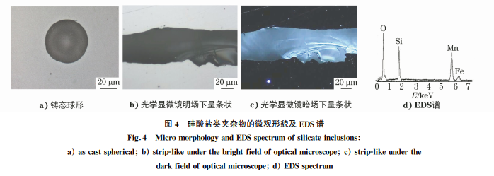 采用硅錳脫氧的鋼中所形成的氧化物主要是硅 酸鹽夾雜物,硅酸鹽夾雜物種類很多,單相的硅酸鹽 如硅酸鐵、硅酸錳等由硅錳脫氧生成,沸騰鋼或半鎮(zhèn) 靜鋼中可見到這類夾雜物。在鋁鎮(zhèn)靜鋼和鈣處理鋼 中很少形成硅酸鹽類夾雜物,但在特殊情況下如鋼 液澆注溫度偏高、鋼液發(fā)生二次氧化后會(huì)形成較多 球狀硅酸鹽夾雜物。